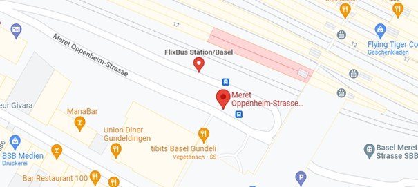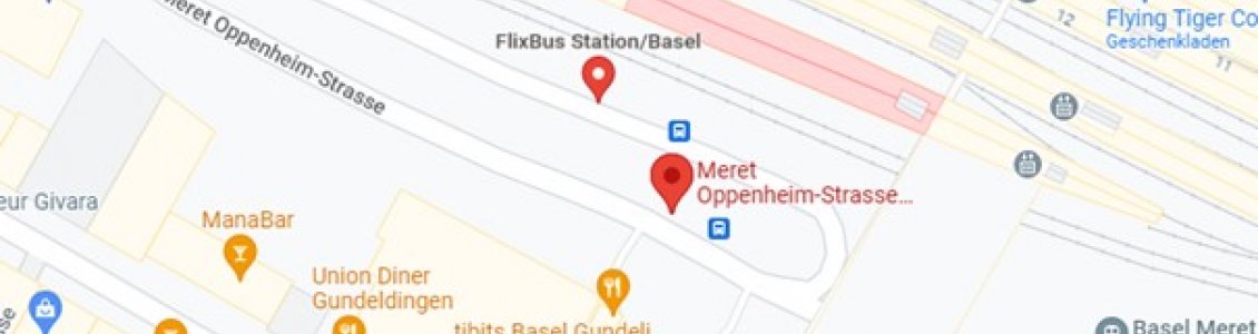 Unsere Carreisen ab Basel beginnen Basel SBB Meret Oppenheim-Strasse. Der Zustieg befindet sich direkt am Bahnhof in der Meret Oppenheim-Strasse. Der Einsteigeort ist mit vielen öffentlichen Verkehrsmitteln zu erreichen. Ein Parkhaus befindet sich in der Nähe.
