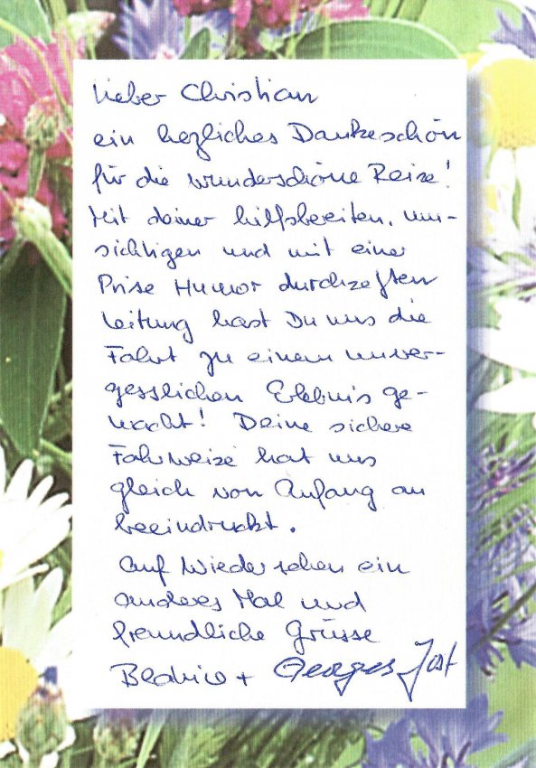 Was uns aber am meisten beeindruckt hat, war deine ausgezeichnete Organisation und dein unermüdlicher, stets geduldiger und freundlicher Einsatz am Steuer oder mit den Reisenden.